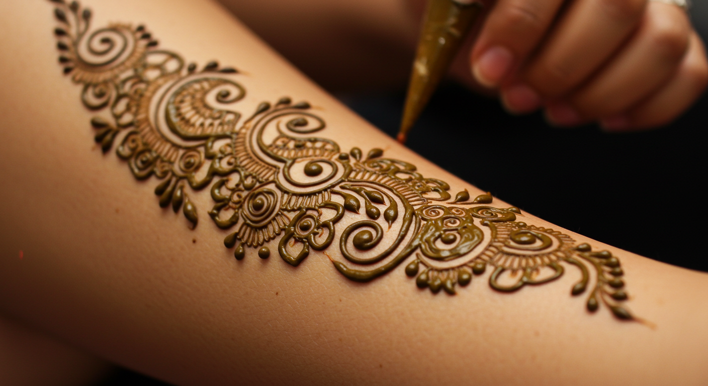 Applying the henna with precision and care, ensuring a comfortable and relaxing experience.